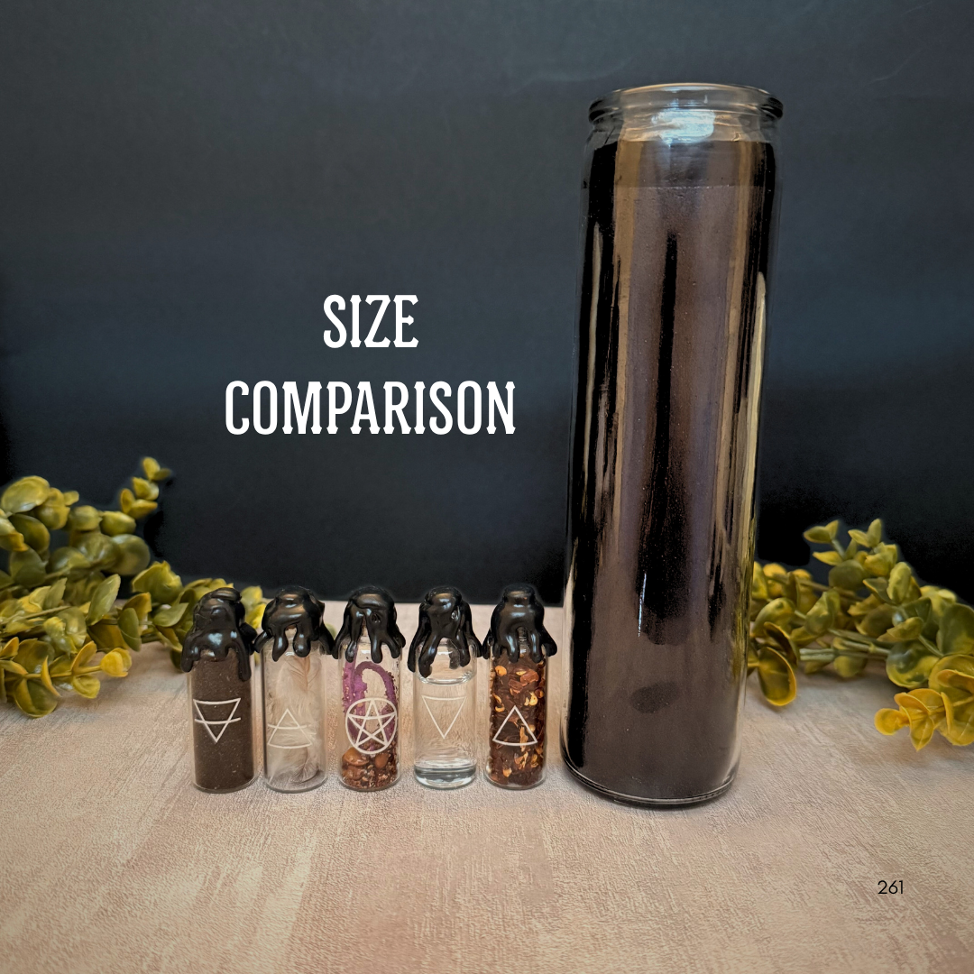 Cast your circle wherever you roam. This set of five mini spell jars represents the elements Air, Earth, Fire, Water, and Spirit, each sealed with its symbolic magic. Use them to call the corners, anchor elemental energy, or deepen your personal workings.