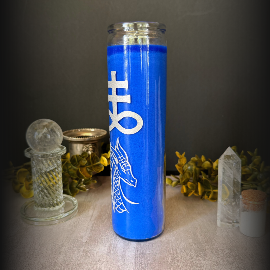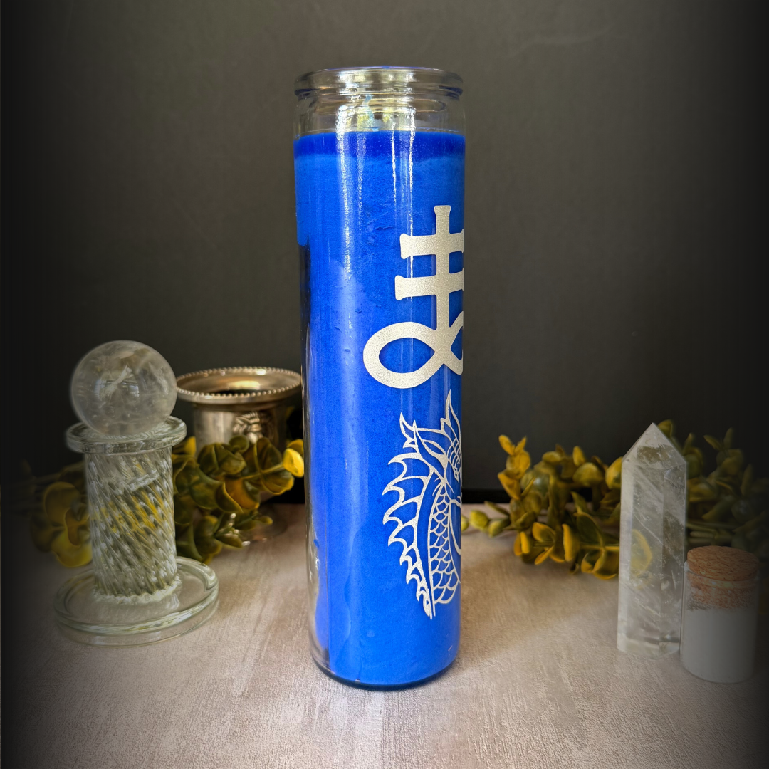 Leviathan Ritual Candle – Blue 8" Altar Candle with Silver Sea Serpent & Sigil