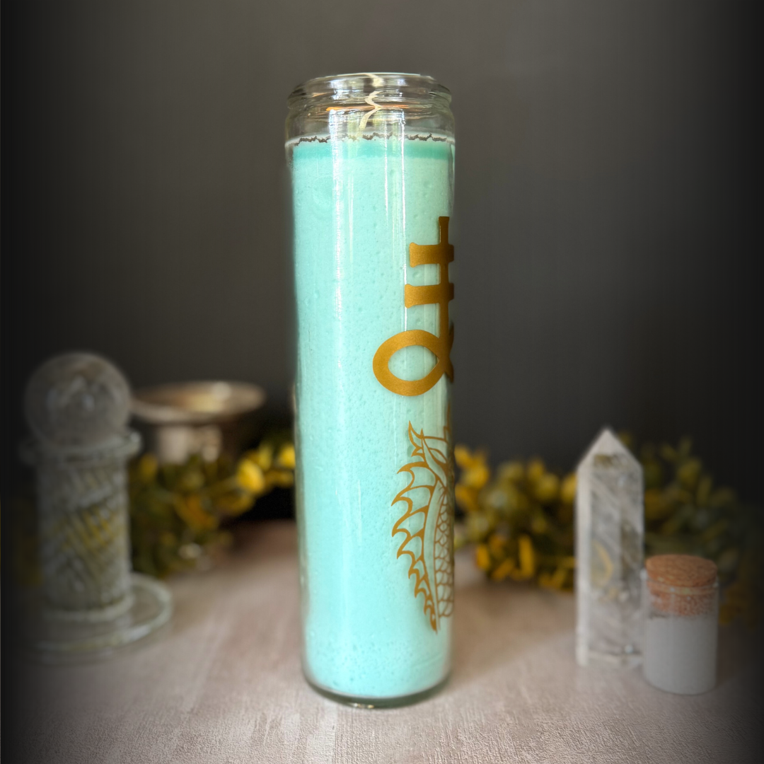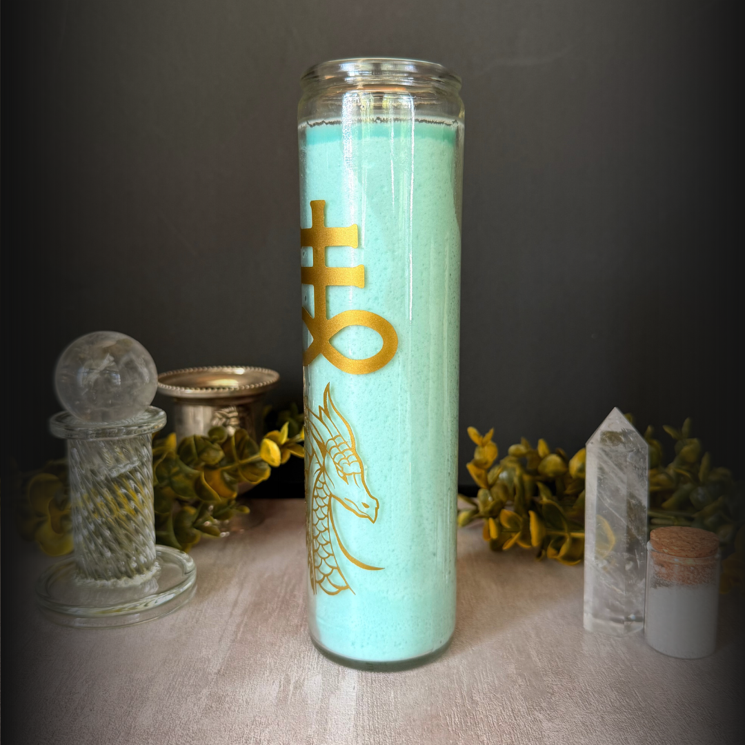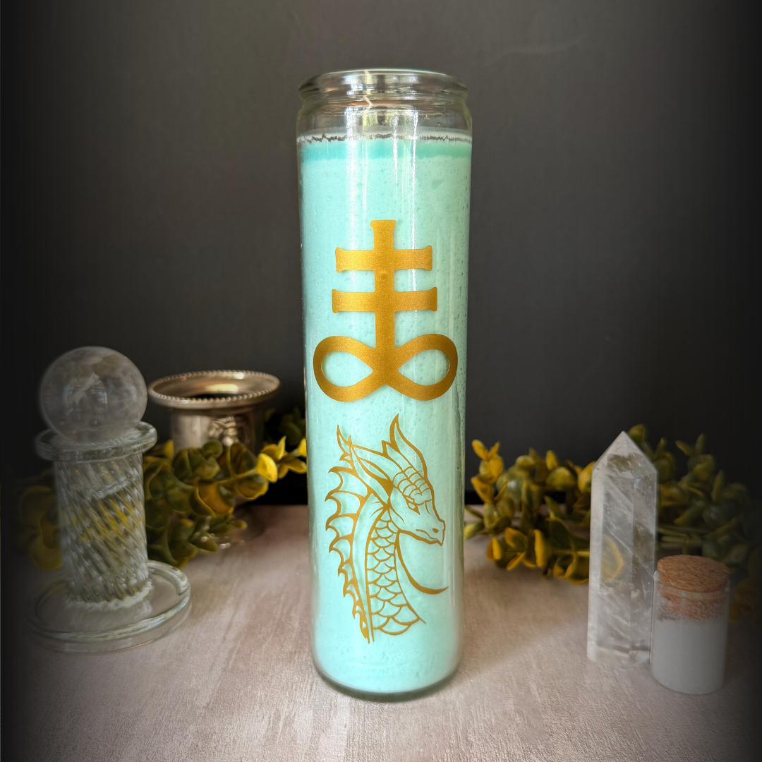 Illuminate the mysteries of the deep with the Leviathan 8-inch Ritual Candle, in aqua wax and adorned with a radiant gold sea serpent and Leviathan's sacred symbol. This candle channels Leviathan’s dominion over the seas, embodying strength, transformation, and the hidden currents of power that flow beneath the surface.